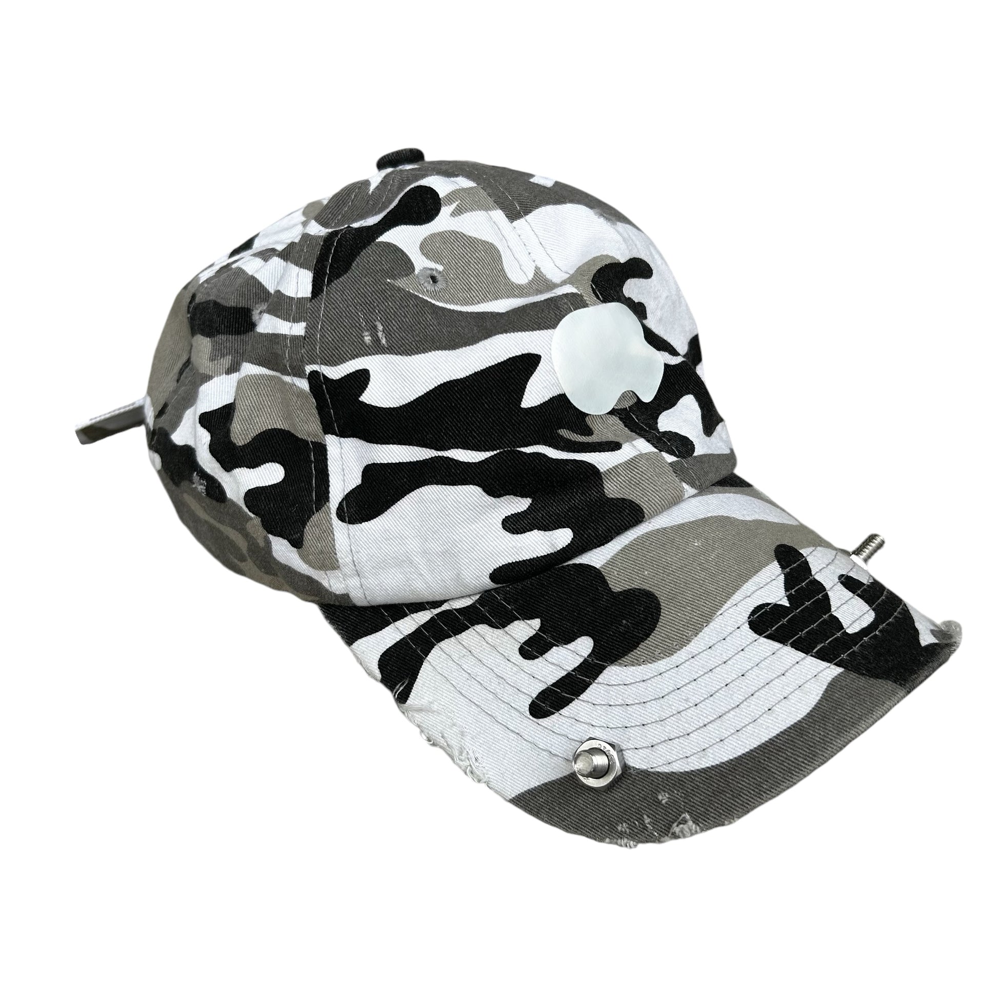 Non-stretch cotton twill cap. Bolted, destroyed, and finished by hand. Blot logo printed at face. Metal bolts protrude through brim secured by hex nuts.